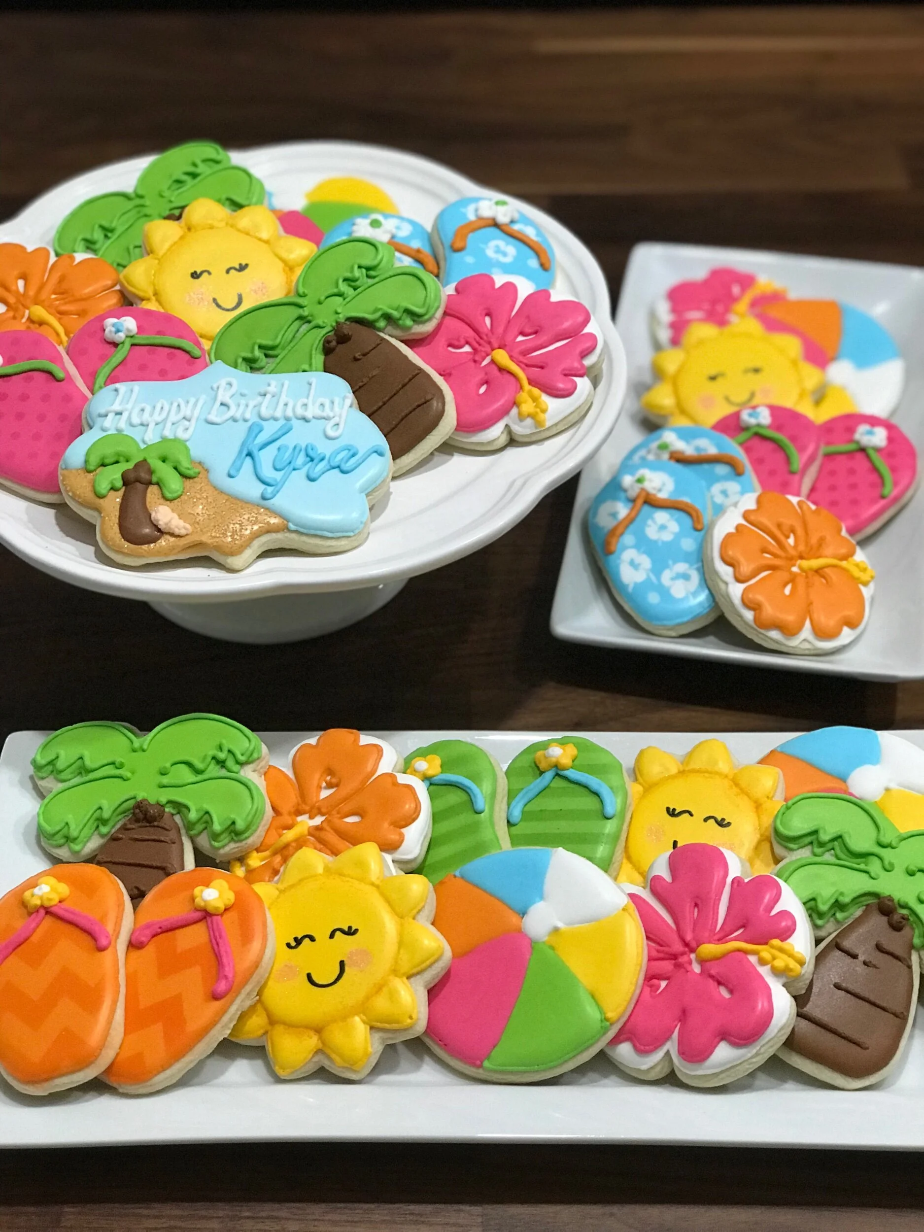 Birthday cookies for our cousin Kyra!! Thank you Kim Freeman for all your support, love you!! #TropicalCookies #BeachCookies #DecoratedCookies #RoyalIcingCookies #RoyalIcing #TampaBayBakers #TampaSmallBusiness #SweetlyInspired #BirthdayCookies www.sweetlyinspiredlife.com