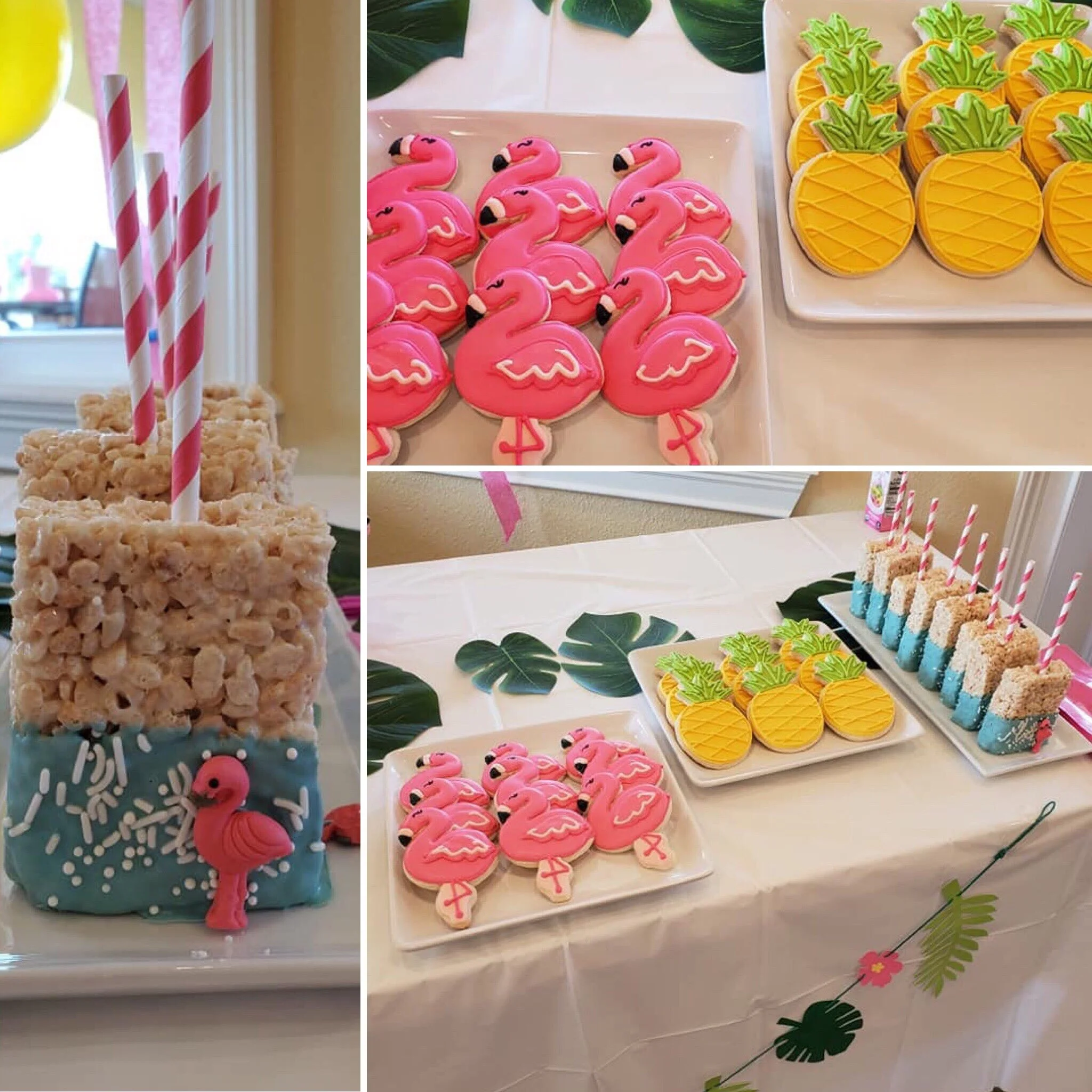 Teamed up again with Cake Junkies who made these amazing rice Krispy treats!! Heather Bandy did an amazing job displaying everything !! Thanks girl, you ROCK!! #cakejunkies #RiceCrispyTreats #PineappleCookies #FlamingoCookies #TropicalParty #TropicalCookies #DecoratedCookies #RoyalIcing #RoyalIcingCookies #TampaBayBakers #TampaSmallBusiness #SweetlyInspired www.sweetlyinspiredlife.com