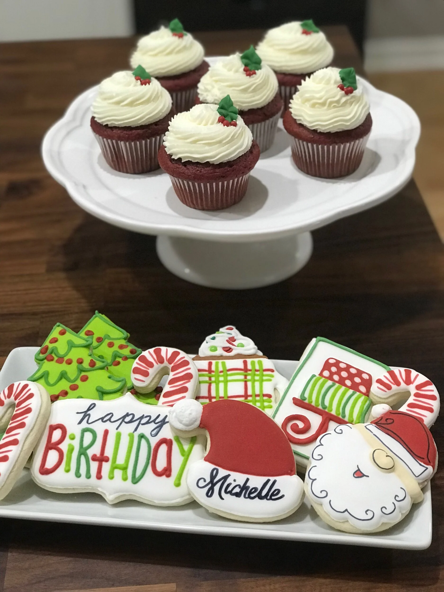 Happy birthday Michelle Vagel!! Hope you enjoyed these treats! Thank you so much Nancy Fitzpatrick for the order and Andrea Bennett for picking them up! #christmascookies #birthdaycookies #redvelvetcupcakes #cookies #royalicing #decoratedcookies #sugarcookies #sweetlyinspired #TampaBayBakers #TampaSmallBusiness #RoyalIcingCookies www.sweetlyinspiredlife.com