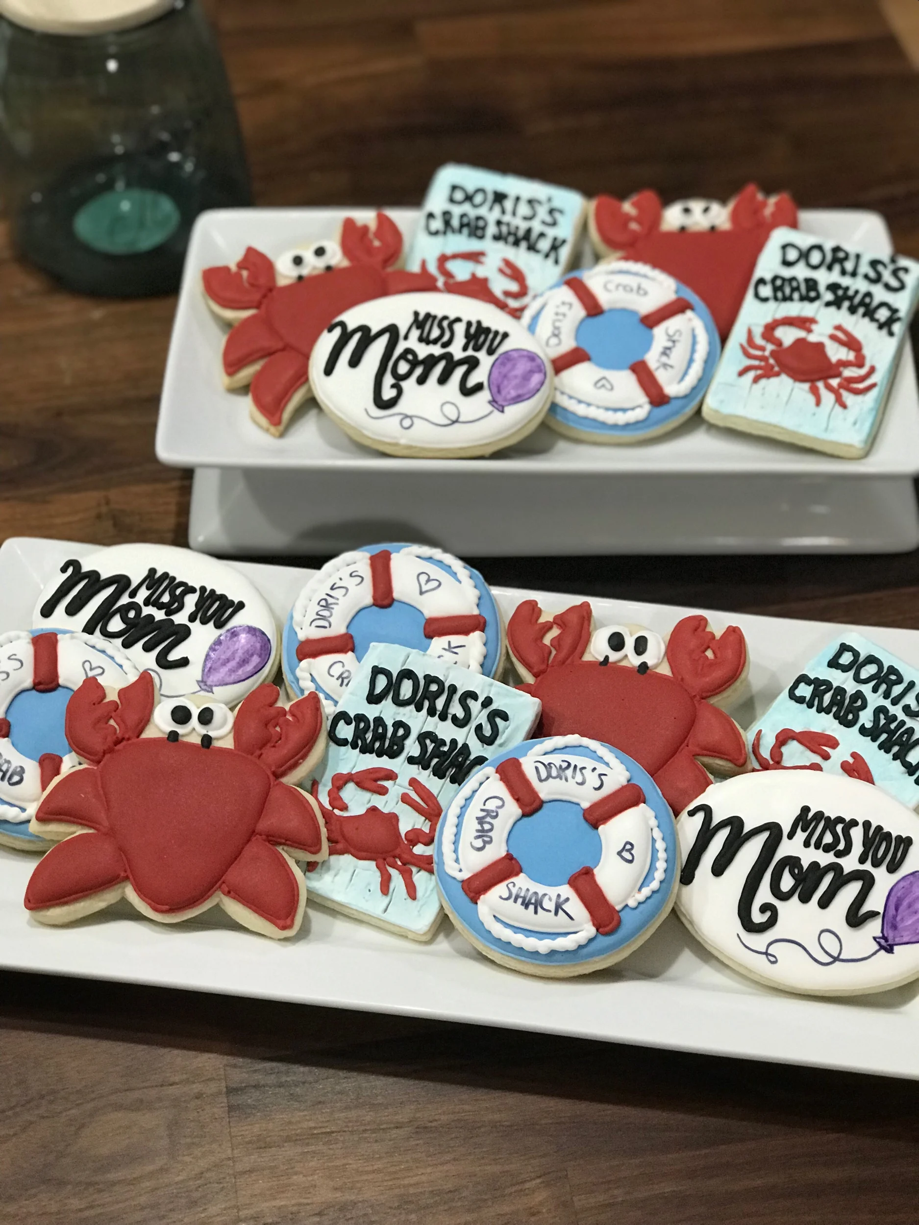 A very special tradition to remember a very special mom. Thank you Debbie Kinser!! Www.sweetlyinspiredlife.com #decoratedcookies #royalicingcookies #royalicing #crabshack #crabcookies #inmemory #nauticalcookies