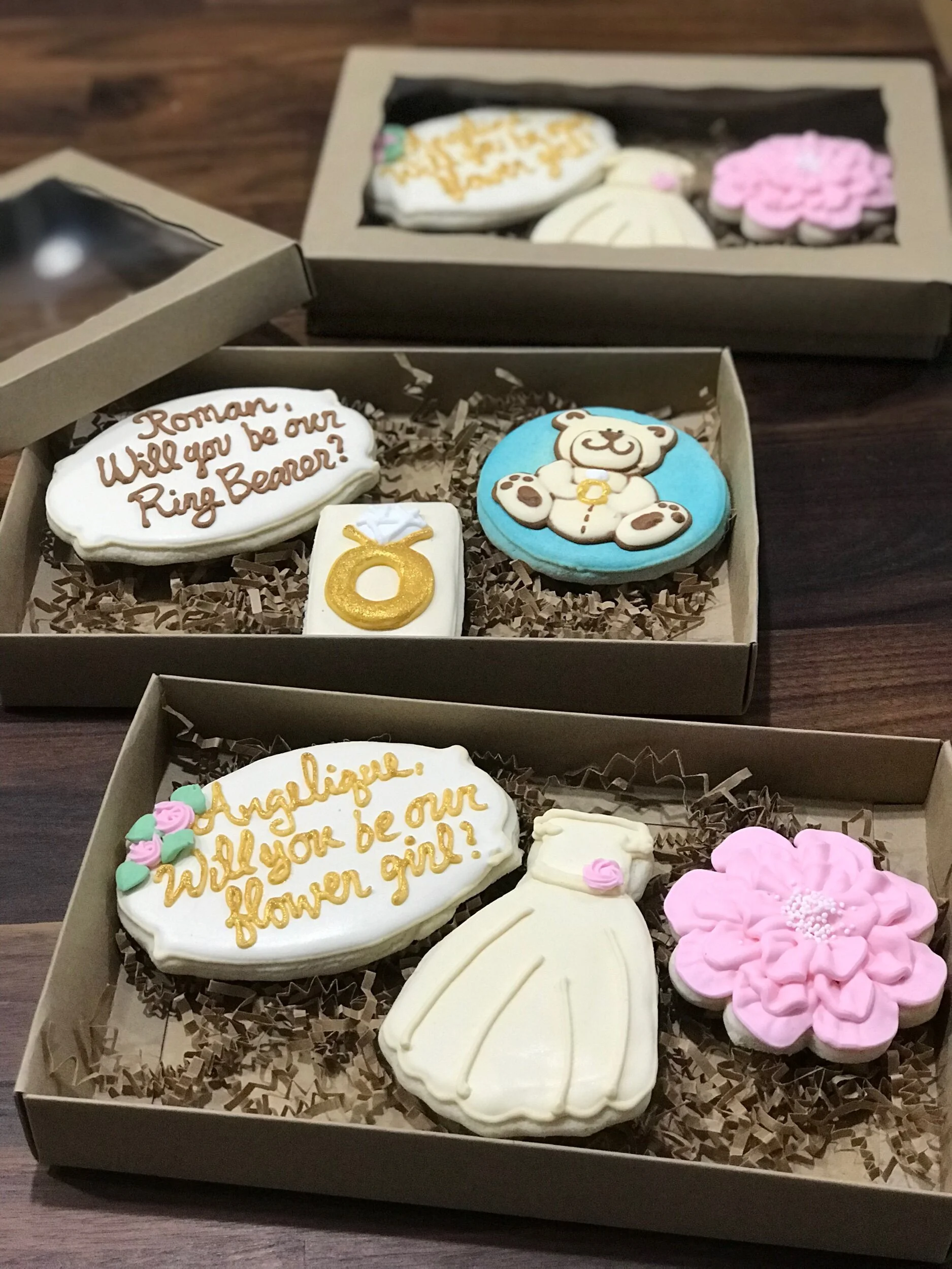 Flower girl and ring bearer gift boxes. What a great idea, thank you Natalie and Kayla Castellano!! #FlowerGirlCookies #GreenBearCookies #WillYouBeMyFlowerGirl #WillYouBeMyRingbearer #cookies #royalicing #decoratedcookies #sugarcookies #sweetlyinspired #TampaBayBakers #TampaSmallBusiness #RoyalIcingCookies www.sweetlyinspiredlife.com