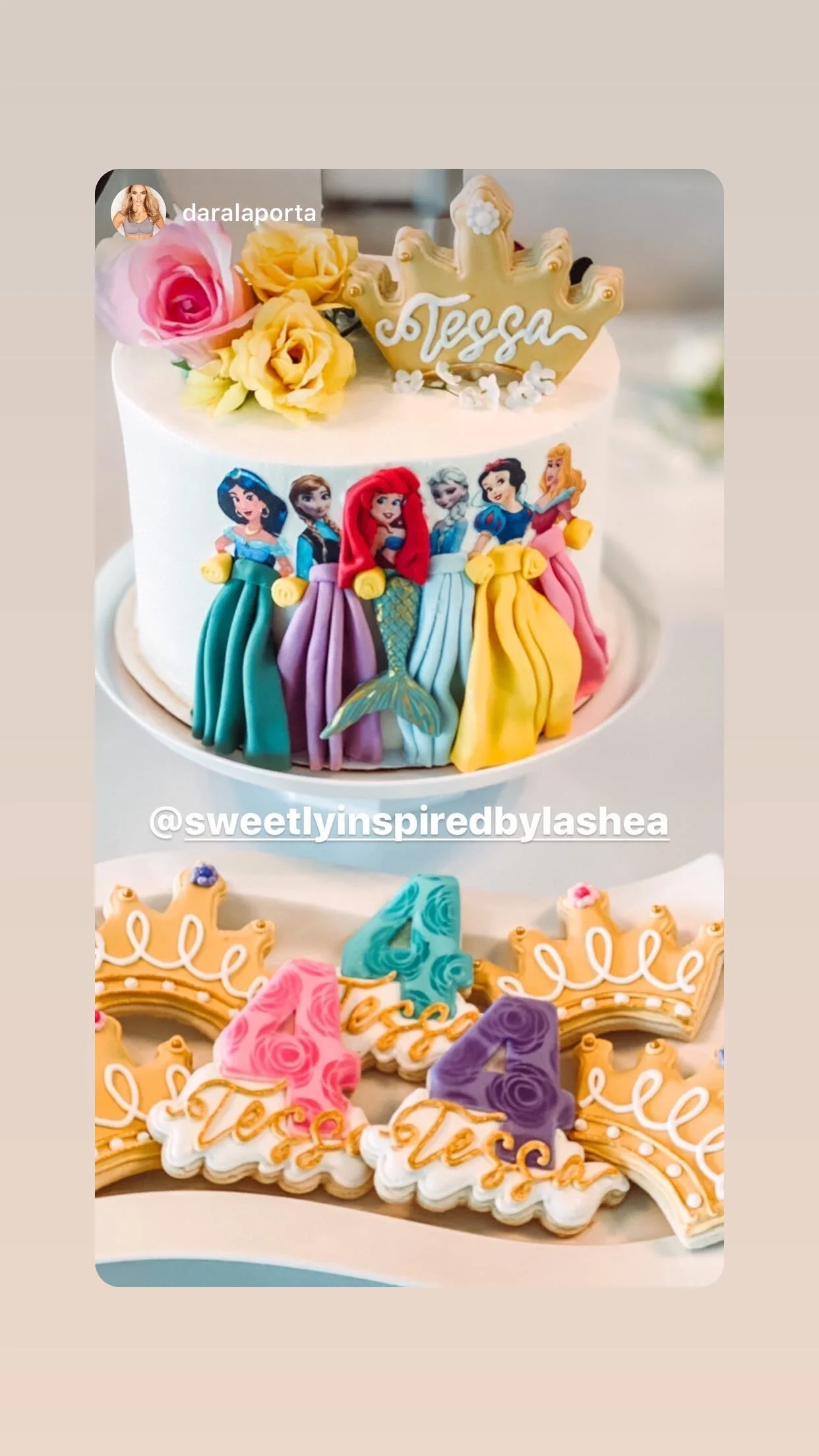 Happy Birthday sweet Tessa, I hope you had a magical day! Thank you so much Dara LaPorta For your constant support and for the awesome picture! #DisneyPrincessCake #PrincessCookies #Disney #cookies #royalicing #decoratedcookies #sugarcookies #sweetlyinspired #cupcakes #cakes #TampaSmallBusiness #supportsmallbusiness #RoyalIcingCookies www.sweetlyinspiredlife.com