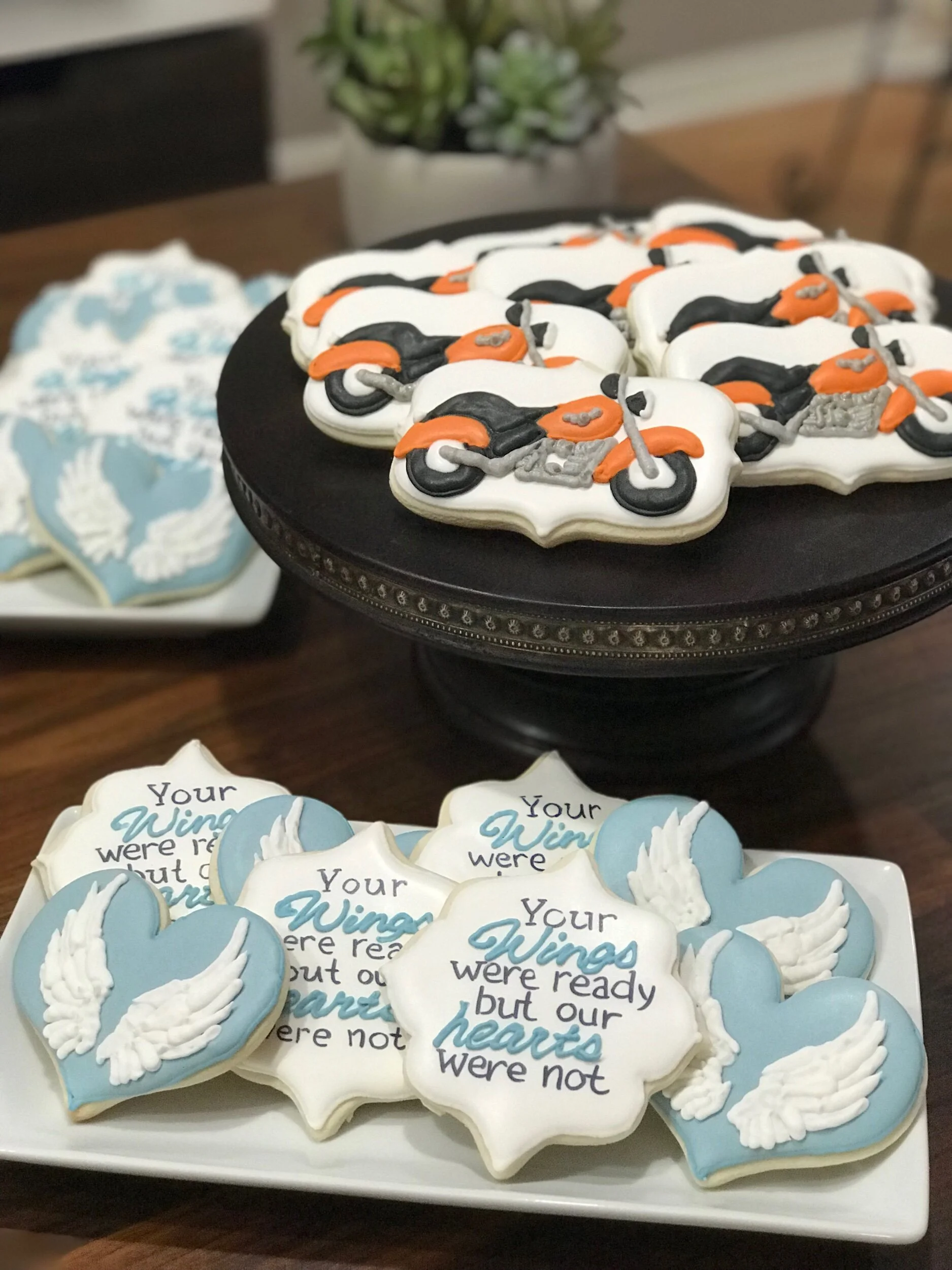 Saying goodbye to loved ones is so hard. Elizabeth Cole Davis, celebrating her mother-n-law with her favorites, bikes and baby blue. I know she is smiling down at you all and waiting to see you again! #memorialcookies #MotorcycleCookies #WingCookies #cookies #royalicing #decoratedcookies #sugarcookies #sweetlyinspired #TampaBayBakers #TampaSmallBusiness #RoyalIcingCookies www.sweetlyinspiredlife.com