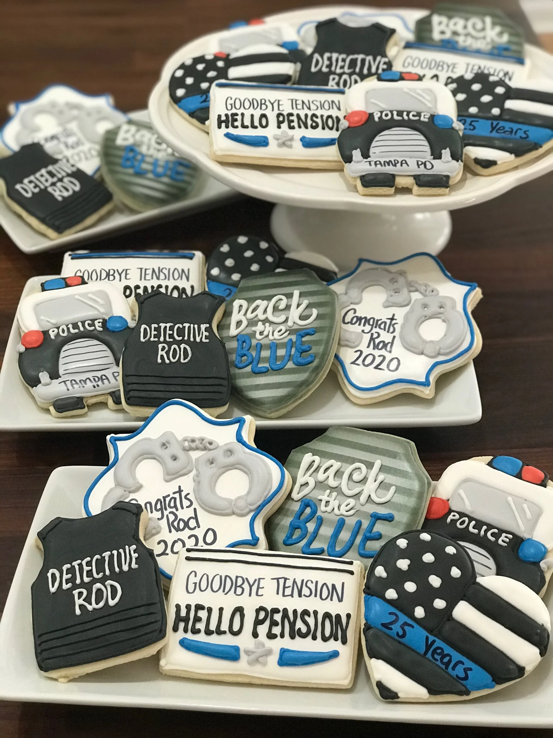 Happy Retirement Rod!! Thank you so much Kathy Glyder for your constant support, I loved getting to do this for you! #backtheblue #RetirementCookies #TampaPolice #cookies #royalicing #decoratedcookies #sugarcookies #sweetlyinspired #cupcakes #cakes #TampaSmallBusiness #supportsmallbusiness #RoyalIcingCookies www.sweetlyinspiredlife.com